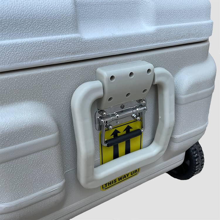 本款产品是180L三十六联罐的生物安全运输箱,是较大规格尺寸的,本款生物安全运输箱由于体积较大,因此采用了滚轮,这样方便防疫工作人员在户外采集时搬运样本;同时考虑到本款产品尺寸较大,在装满采集样本后整体生物安全运输箱的重量会偏重,为了保证送检的安全可靠性,安装了304不锈钢的手柄,这样就不会出现在搬运过程中出现提手断把的问题了。